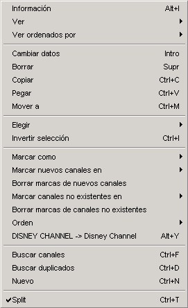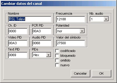 La ventana principal con la lista de satétites, Transpondedores, favoritos, y los canales.