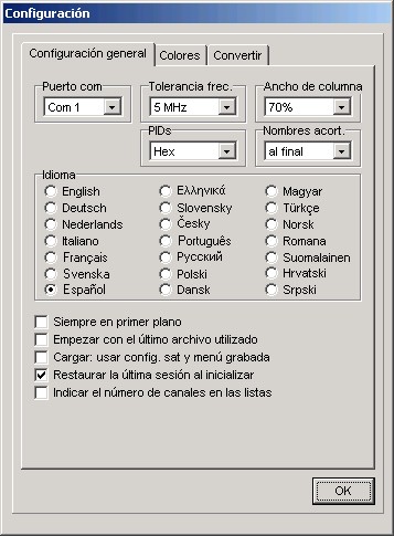 Aquí puede elegir el idioma del menú, configurar los puertos de comunicacóin, elegir si quiere ver/introducer PIDs en decimal o hexadecimal, introducer la tolerancia de frecuencia para la importación, mantener el editor siempre en pantalla o cambiar los colores en la lista de objetos.