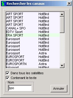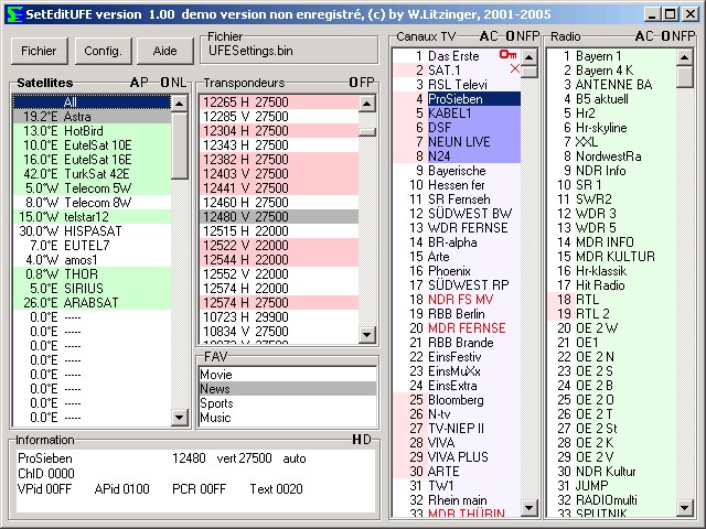 La fentre principale, vous voyez tous les satellites, transpondeurs, FAV, et naturellement les canaux.