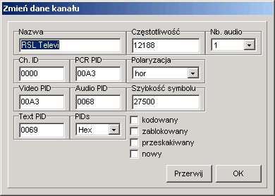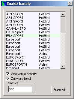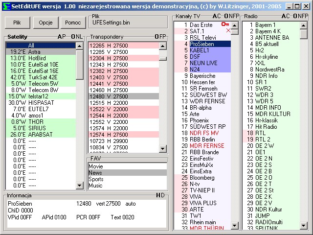 Okno główne, tutaj widzimy wszystkie satelity, transpondery, ulubione, i oczywiście kanały.