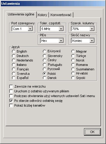 Tutaj możecie wybrać język menu, konfigurację portów, zdecydować czy chcecie widzieć/ wprowadzać PIDs w systemie dziesiętnym, czy szesnastkowym, wprowadzić tolerancję częstotliwości, umieścić okno edytora na wierzchu albo zmienić kolory zaznaczeń na listach.