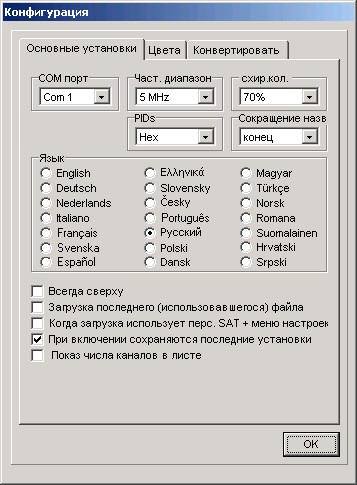Здесь Вы можете выбрать язык меню, интерфейс, изображение PID, настройки листа каналов, задать допустимое отклонение частоты для импорта неизвестных форматов. Кроме того, вы можете здесь изменить шрифт и фон.