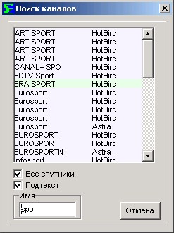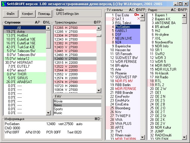 Главное окно, здесь Вы видите все спутники, транспондера, FAV, и, конечно каналы