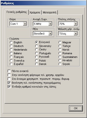 Εδώ μπορείτε να επιλέξετε γλώσσα, τη μορφή των PID (δεκαδική ή δεκαεξαδική) και της λίστας καναλιών, την ανοχή συχνότητας για την εισαγωγή άλλων μορφών(formats), και να ρυθμίσετε τα ports επικοινωνίας. Εξάλλου μπορείτε να αλλάξετε τη γραφή και τα χρώματα φόντου του SetEdit.