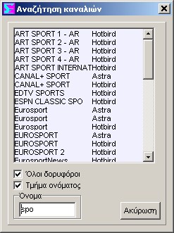 Το κυρίως παράθυρο, εδώ βρίσκονται: δορυφόροι, αναμεταδότες, αγαπημένα, και φυσικά τα κανάλια.