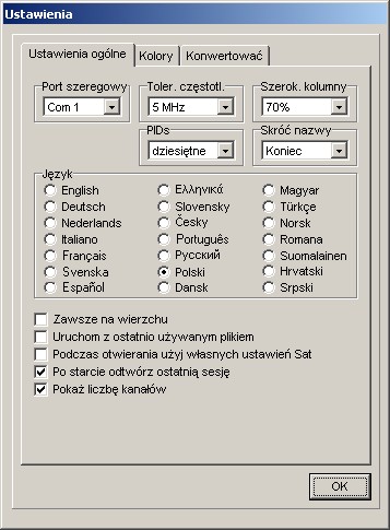 Tutaj możecie wybrać język menu, konfigurację portów, zdecydować czy chcecie widzieć/ wprowadzać PIDs w systemie dziesiętnym, czy szesnastkowym, wprowadzić tolerancję częstotliwości, umieścić okno edytora na wierzchu albo zmienić kolory zaznaczeń na listach.