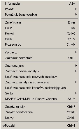 Główne menu listy kanałów.