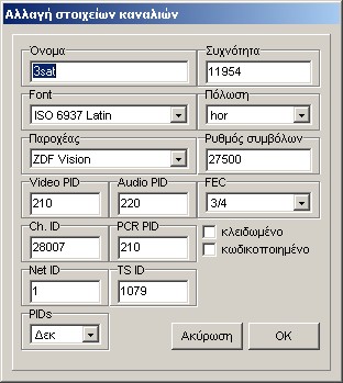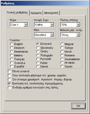 Εδώ μπορείτε να επιλέξετε γλώσσα, τη μορφή των PID (δεκαδική ή δεκαεξαδική) και της λίστας καναλιών, την ανοχή συχνότητας για την εισαγωγή άλλων μορφών(formats), και να ρυθμίσετε τα ports επικοινωνίας. Εξάλλου μπορείτε να αλλάξετε τη γραφή και τα χρώματα φόντου του SetEdit.