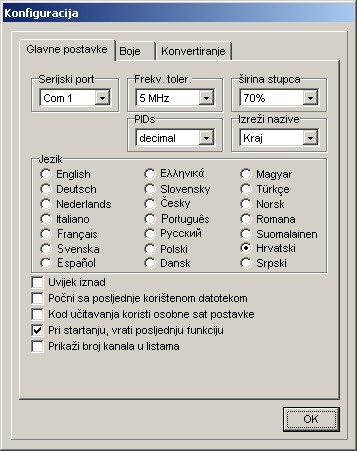 Ovdje možete izabrati izbornik za jezike, namjestiti portove za komuniciranje, izabrati ako želite vidjeti/unijeti u dekadskom ili heksadekadskom obliku, unijeti dozvoljenu frekvenciju za import, čuvati editor uvijek iznad svih ili promijeniti boje stavkama liste.